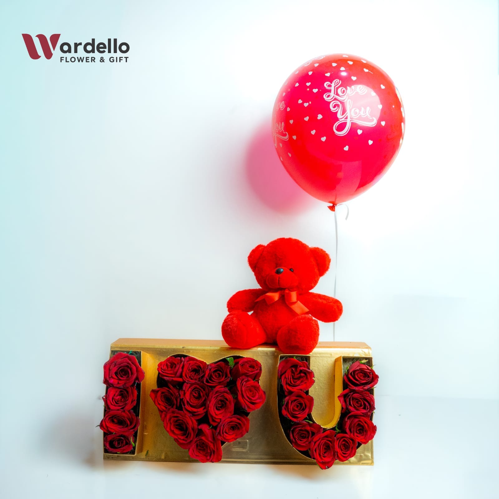 It features 23 premium red roses, carefully placed inside a luxurious golden box to form the word LOVE, highlighted by a heart-shaped design at the center.