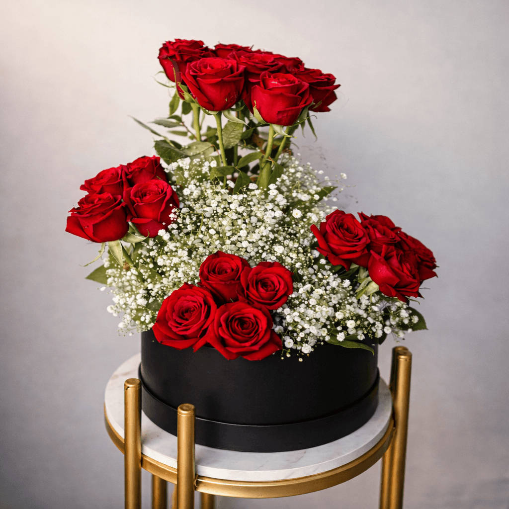 A luxurious black box featuring 20 fresh red roses with delicate gypsophila, creating a timeless and elegant romantic arrangement.