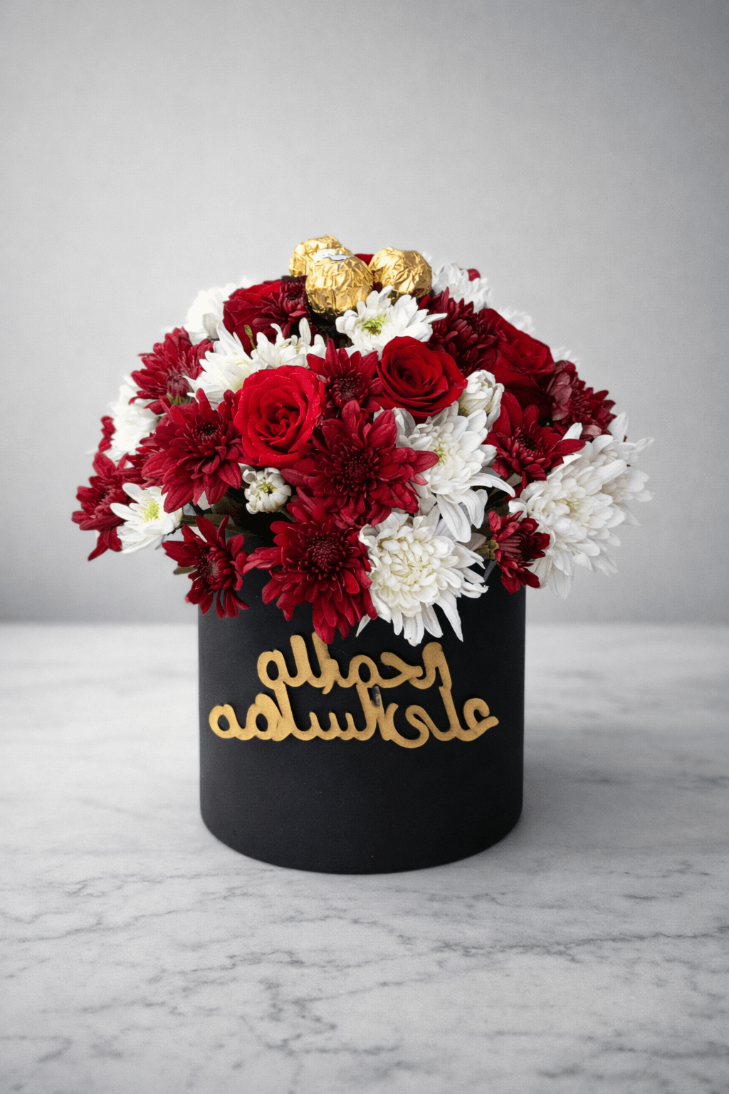 This premium arrangement features a luxury black round box filled with a rich mix of red & white seasonal flowers, topped with gold-wrapped premium chocolates for an extra classy touch.